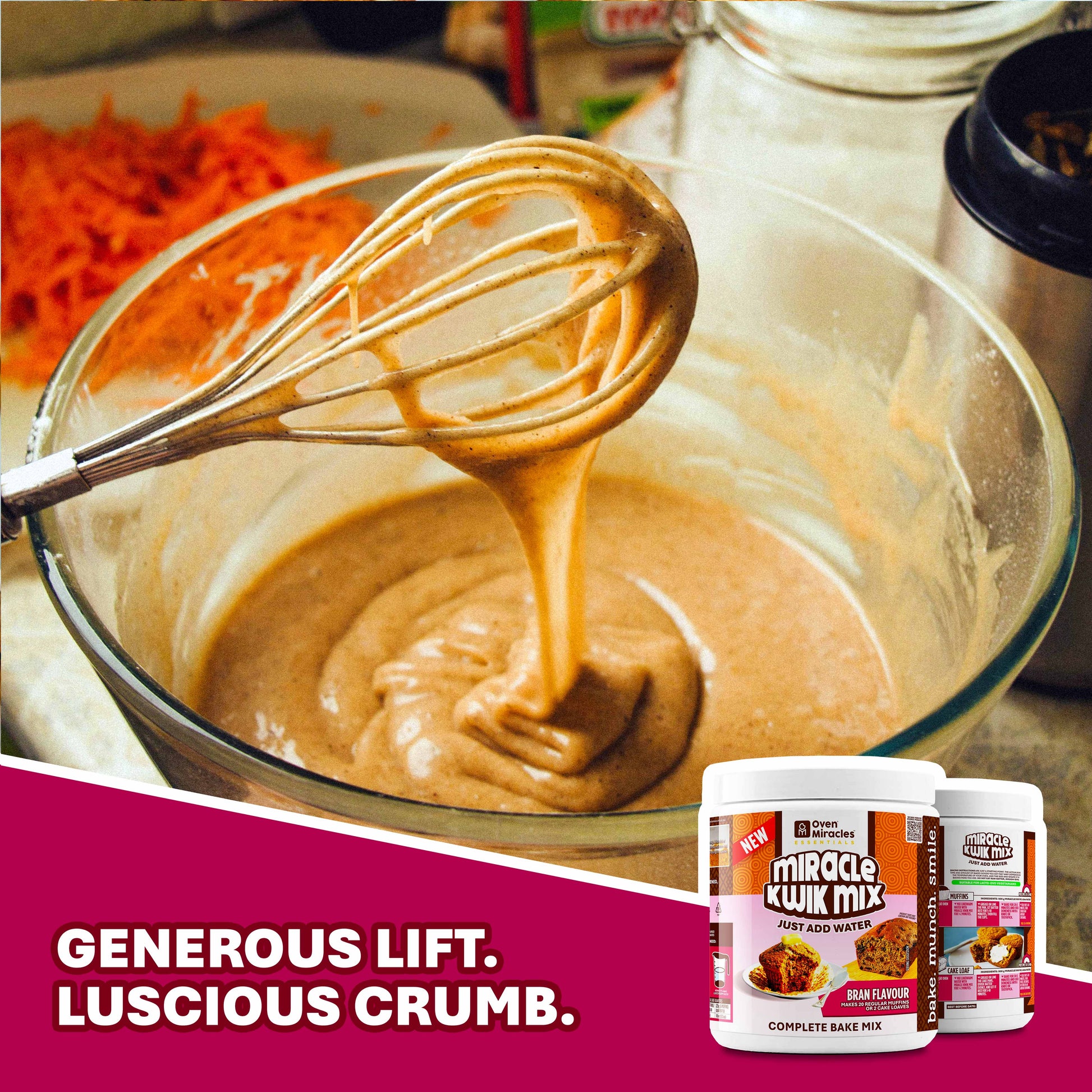 Bakes into delicious breakfast muffins to be topped off with butter and grated cheese, or moist carrot cakes and hearty banana muffins—just add water and get wholesome texture with every slice