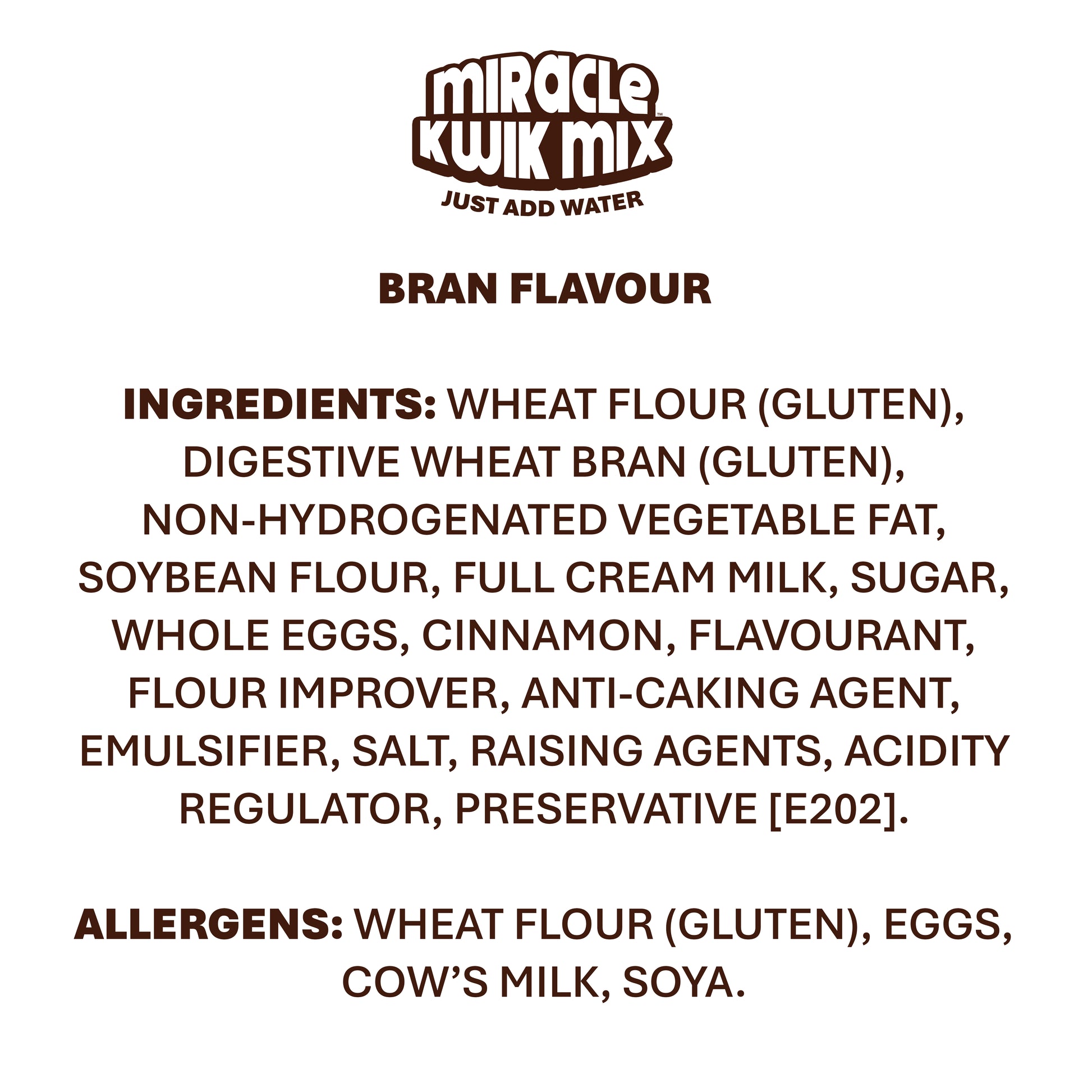 Ingredients: Wheat Flour (Gluten), Digestive Wheat Bran (Gluten), Non-Hydrogenated Vegetable Fat, Soybean Flour, Full Cream Milk, Sugar, Whole Eggs, Cinnamon, Flavourant, Flour Improver, Anti-Caking Agent, Emulsifier, Salt, Raising Agents, Acidity Regulator, Preservative [E202].